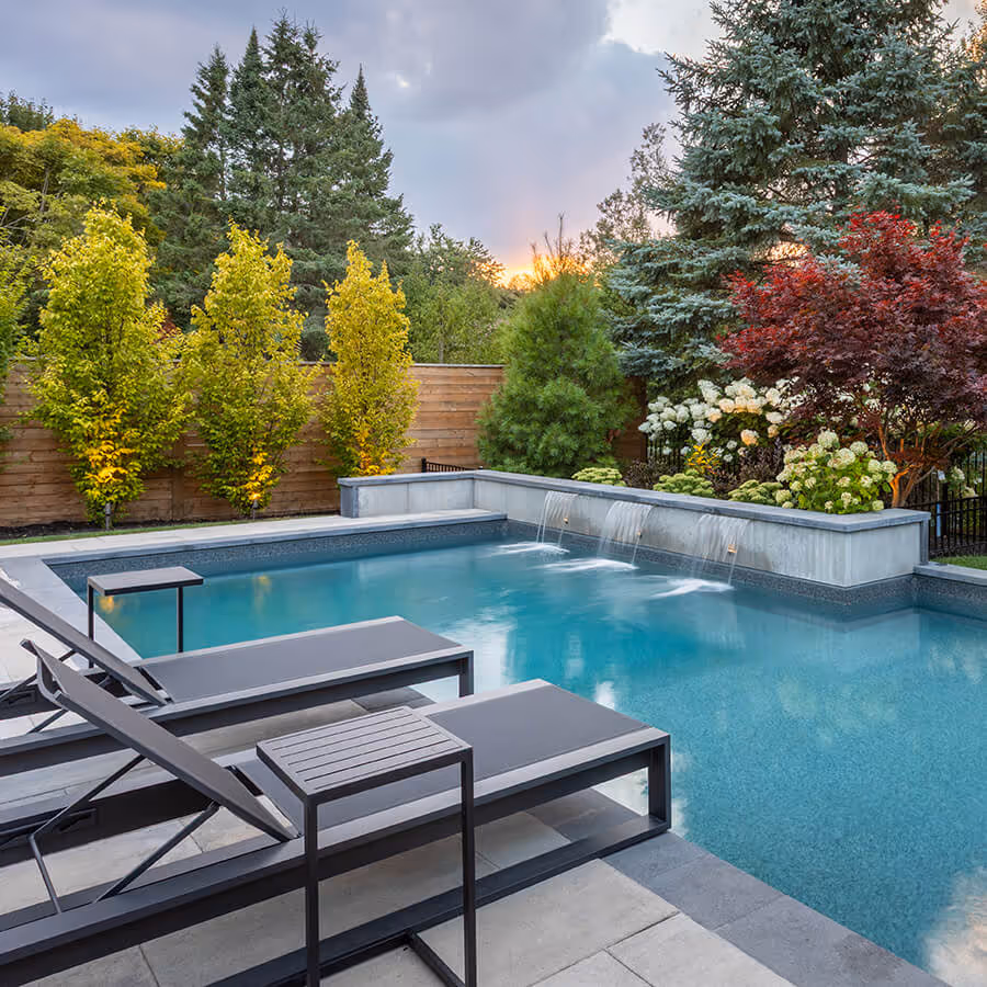 We anchored the space with a flat-roof cabana and lounge for movie nights or games. A wood-burning fireplace adds warmth, water features bring calm, and a sauna with hot tub makes the backyard usable year-round.