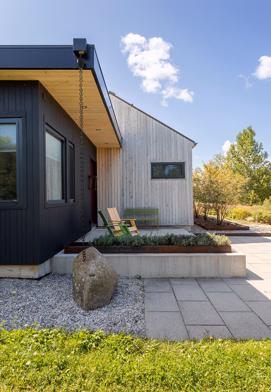 A raised sitting area became a key feature, built from thermally modified ash and left untreated so it can naturally weather into a rustic, aged look. Formed concrete planters paired with Corten steel garden edging add contrast and texture, helping the landscape feel like it has been there for years rather than brand new.
